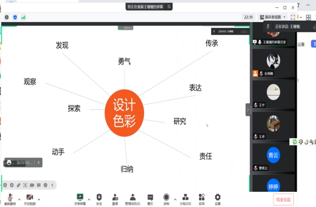 随后,王老师将自己进行课改后的设计色彩课程中的一些心得与大家进行分享交流。基于创客视域以设计色彩课程为研究对象,进行色彩教学课程改革的研究,探讨如何将设计色彩与培养创新意识、创新思维和创新能力相结合。针对高职院校中美术“零基础”的学生如何提高学生的主观能动性,增强学生艺术设计自信和设计水平。