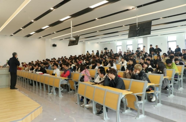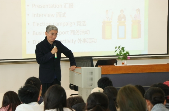 交流会上,朱教授又再次用风趣幽默的语言围绕公众演讲的历史、起源和发展,深入浅出,娓娓道来。让全体师生了解了公共演讲的种类,清晰掌握了公共演讲成功的因素、在交际中培养文化差异意识的重要性及其方法。朱教授的发言既有理论高度,又有实践指导意义,全场座无虚席,气氛热烈。在场的师生认真聆听,共同享受了一次文化与技术的盛宴。