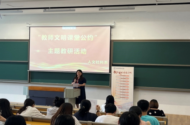 为进一步落实“把立德树人作为教育的根本任务,培养德智体美劳全面发展的社会主义建设者和接班人”这一根本要求,践行“让每一个学生自信面向未来”的办学使命,9月2日下午,人文社科系在善学楼101开展“文明课堂公约”主题活动,人文社科系全体专兼任教师及外聘教师参加,活动由人文社科系副主任啜春红主持。