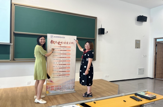 人文社科系副主任啜春红随后带领全体教师进行了“教师文明课堂公约”相关文件学习及交流讨论,并举行了“教师文明课堂公约”展板签名仪式。