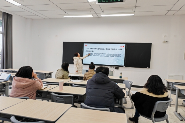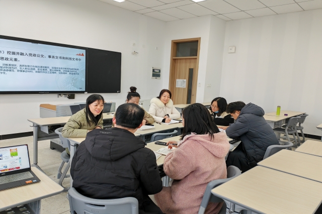 20231212日下午,数学和语文教研室全体老师在思学楼112展开了第15周教研活动,教研活动由蔡云老师主持,主题是讨论如何在应用文写作课程中融入课程思政,实现思政育人。