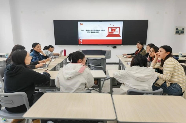 接着,大家重点围绕“怎么融”展开讨论。大家一致认为应结合学生专业特点有重点地将会议精神融入课堂教学中,如针对工科类专业的学生重点介绍习近平总书记关于新质生产力的重要论述等。在教学中,需选取贴近学生生活实际的教学案例来增强课堂的亲和力和实效性。同时,通过“专题讲授+有机嵌入”“思政小课堂+社会大课堂”等多种路径融入,引导学生在生活和学习中践行党的二十届三中全会精神。