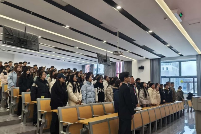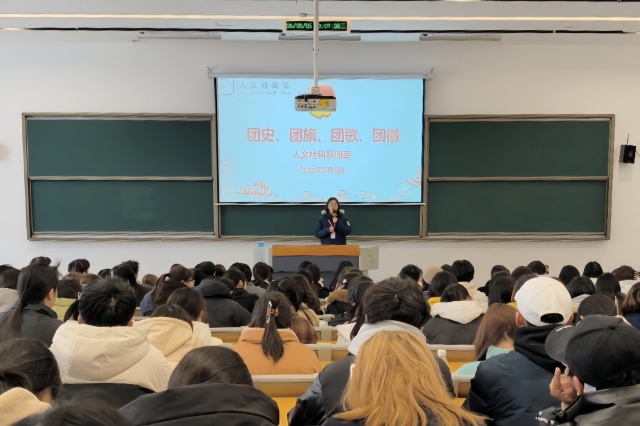 在热烈的氛围中,全体人员齐唱团歌,青春激昂的歌声回荡在整个会场,展现出同学们对共青团的无限向往与坚定信念。团歌结束后,团委书记芮慧娟为大家讲授第一课团史。芮书记以丰富的史实、生动的案例,详细讲述了共青团的发展历程、光辉成就以及在不同历史时期的重要作用,让同学们对共青团有了更深刻的认识和理解,进一步激发了他们加入共青团的决心。