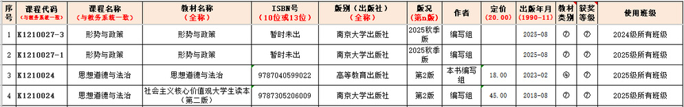 为规范教材建设与管理、做好教材编写、审核、选用等各项工作,提高教材建设水平,确保教材选用质量,依据教育部《职业院校教材管理办法》(教材【2019】3号)、教育部等5部门印发《关于教材工作责任追究的指导意见》和开元《教材建设与管理实施细则》(南机电院【2020】50号)等文件精神,现将2025年秋季(2025-2026学年第一学期)教材选用的结果(见下表)进行公示。