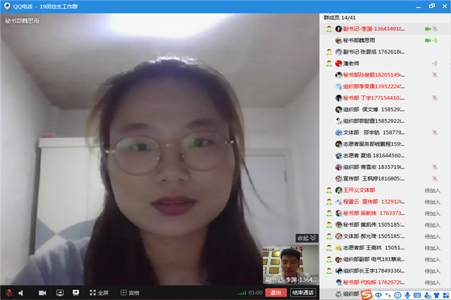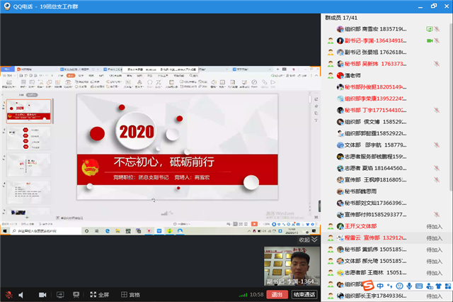 为加强团组织自身管理,提高团干队伍整体素质,为团总支提供有力的组织保障,并服务好团员青年。开元自动化工程系团总支二轮换届竞聘于2020年6月15日下午17:30在博学楼B301举行。因受疫情影响,本次竞聘选在线上举行。参加本次竞聘评委的有自动化工程系团总支书记潘久伟老师、2018级学生副书记和各部门部长。