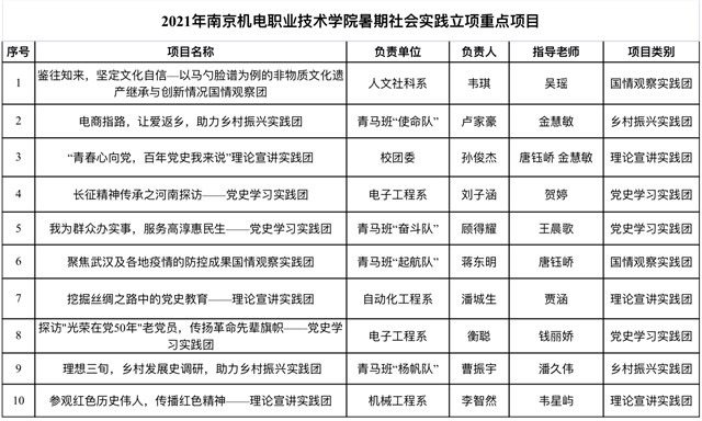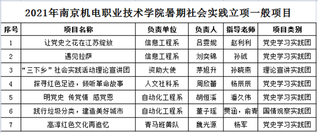为深入学习宣传贯彻习近平新时代中国特色社会主义思想,贯彻落实习近平总书记关于青年工作的重要思想,引导和帮助广大青年学生上好与现实相结合的“大思政课”,在社会课堂中受教育、长才干、作贡献,在观察实践中学党史、强信念、跟党走,努力成为担当民族复兴大任的时代新人,以实际行动庆祝中国共产党成立100周年,按照团省委《关于开展2021年全省大中专学生志愿者暑期文化科技卫生“三下乡”社会实践活动的通知》相关要求,经自主申报,各团总支、青马班审核推荐,校级专家评审,确定以下10个项目为2021年开元暑期社会实践重点立项项目,7个项目为2021年开元暑期社会实践立项一般项目,并对立项的校级重点项目和一般项目进行经费支持,现公示如下: