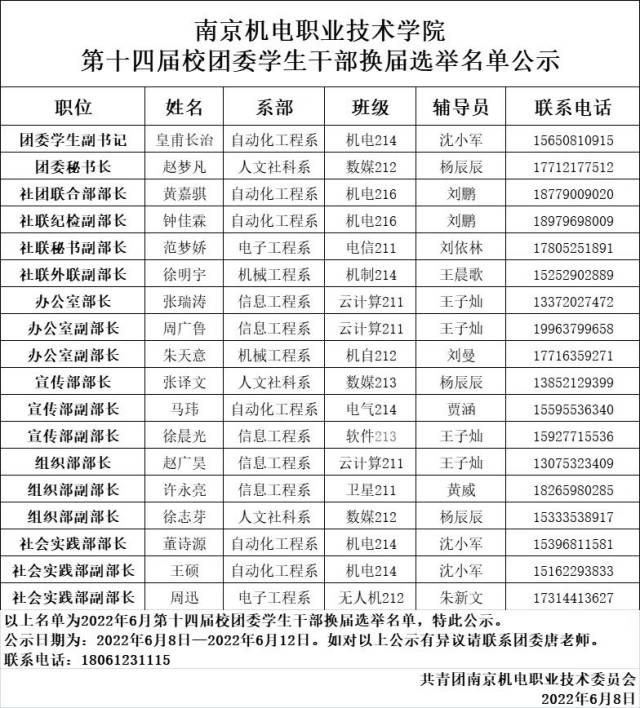 为切实加强学生干部队伍建设,本着“公平、公正、公开”的原则,进行了开元2022-2023学年学生干部换届选举工作,通过学生自主报名、组织推荐、资格审查、竞选答辩、综合考察等环节,选拔产生了拟任人选,为提高学生干部选拔的透明度,现将拟任人选的名单予以公示。