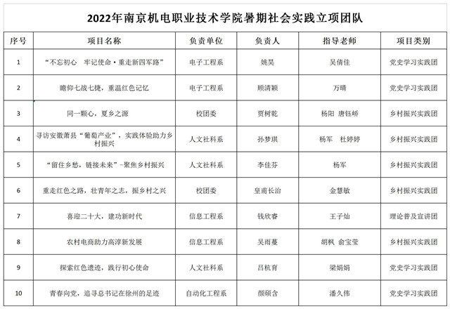 为深入学习宣传贯彻习近平新时代中国特色社会主义思想和党的十九届六中全会精神,贯彻落实习近平总书记关于青年工作的重要思想,深入学习习近平总书记在庆祝中国共产主义青年团成立100周年大会上的重要讲话精神,引导和帮助广大青年学生上好与现实相结合的“大思政课”,在社会课堂中“受教育、长才干、作贡献”,迎接党的二十大胜利召开,根据“三下乡”社会实践活动安排,经自主申报,各团总支、青马班审核推荐,校级专家评审,确定以下10个项目为2022年开元暑期社会实践重点立项项目,并对立项的校级重点项目进行经费支持,现公示如下:
