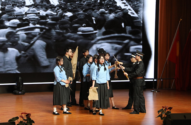 大会在嘹亮的国歌声中拉开帷幕,新入团团员面向鲜艳的团旗庄严宣誓,让听党话、跟党走成为自觉追求,立志在实现中华民族伟大复兴的时代洪流中踔厉奋发、勇毅前行。话剧《破晓》将1919年青年压抑已久的热血激情和为祖国的担忧表现得淋漓尽致,仿佛穿越一百多年的时光隧道响彻耳畔,现场观众纷纷被台上的情绪所感染,掌声雷动。