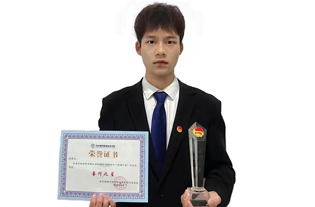 徐晨光,男,汉族、共青团员,毕业于湖北省荆州市洪湖市贺龙高级中学,来自信息工程系软件技术213班。现担任校团委助理、校团委宣传部副部长、班级副班长、团支部副书记、心理委员、墨客书法社社长、群星争鸣辩论社副社长、思齐苑301宿舍长。在校负责开元学工处微信公众号、开元官方抖音号运营工作。在开元学工处微信公众号打造【防疫锦囊】、【禁烟科普】、【学工周记】特色系列推文。【禁烟科普】系列推文的打造为我校师生的身体健康提供了可靠的理论支撑,拓展了我校健康教育的内涵,有力推动了校园精神文明建设。2022年度共参加校内为志愿服务60余次,累计服务时长超过500小时。