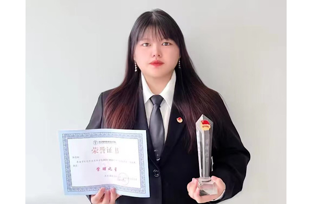 2021-2022学年,荣获开元优秀共青团员、优秀志愿者、暑假社会实践优秀个人;2022年4月,荣获南京新工投资集团疫情防控荣誉证书;2022年10月,荣获“训练标兵”称号;2022年11月,荣获第二期青马班“结业证书”及“优秀学员”称号;2022年11月,荣获“第十四期学干培训优秀学员”。2023年3月;荣获校“寒假社会实践优秀个人”“优秀团队”;2023年4月,荣获高淳国际马拉松志愿者证书;2023年4月,荣获第七届江苏省大学生知识产权知识竞赛中荣获优秀奖。