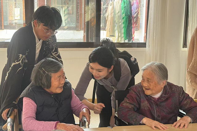 10月24日下午一点整,由槿漫轩花社、云裳汉服社,DIY创意社、生活部的部分代表同学从开元出发前往高淳高堂老街颐养中心看望爷爷奶奶。在护理姐姐的主持下,同学们与爷爷奶奶一起玩起数字游戏,一下就拉近了彼此的距离。