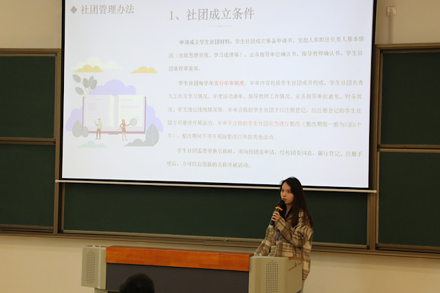 张自仪向参会人员解读社团制度,明确社团管理办法、星级社团评定办法、社团指导老师选聘管理及考核办法和活动室管理办法,落细落实社团管理,指导老师加强审核,最后阐述了社团目前存在的问题以及社团未来的发展方向。