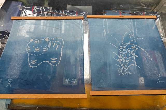 师傅首先向我们展示了刻板的过程。刻板是蓝印花布制作的关键环节之一,需要工匠们用刻刀在木板上精心雕刻出各种图案。师傅的手法娴熟,刻刀在木板上飞舞,不一会儿,一个精美的图案就呈现在我们眼前。看着师傅专注的神情,不禁感叹传统技艺的博大精深。接着,我们学习了刮浆的技巧。刮浆是将黄豆粉和石灰混合而成的浆糊均匀地刮在刻板后的布料上,这一步需要掌握好浆糊的厚度和均匀度。在师傅的指导下,我们小心翼翼地操作着,虽然手法还很生疏,但却感受到了这门技艺的细腻与严谨。