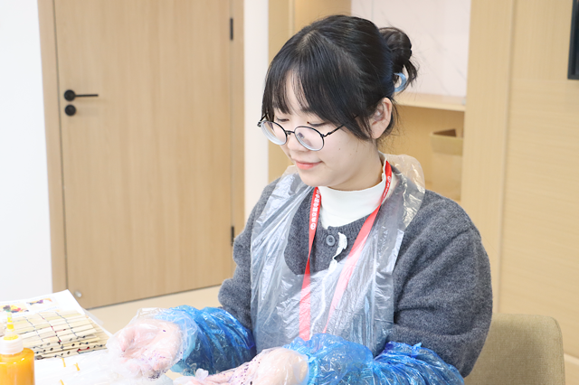 活动现场,同学们对扎染扎结,染色,漂洗等工序的学习,积极制作属于自己独一无二的扎染作品,亲自体验扎染的乐趣,并在活动最后展示了自己精美的作品,每一件作品绚丽的色彩及独特的图案都令人赞叹不已。