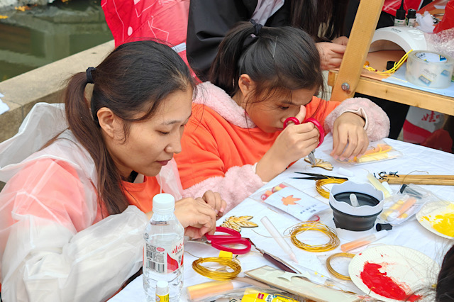 “非遗文创DIY”团队呈现了一系列令人惊叹的非物质文化遗产手工艺品制作展示。团队成员们现场展示了掐丝、兔子灯、蓝晒锦灰堆扇子等传统技艺,并邀请青少年亲身体验制作过程。这一活动不仅让观众领略了传统文化的独特魅力,也加深了他们对中华文化的认同和归属感。
