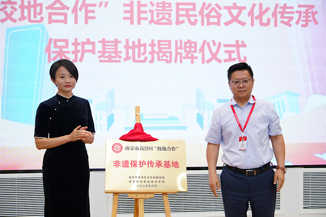 活动当天,启动仪式拉开帷幕。《何为青年》朝气蓬勃的表演瞬间点燃全场气氛,赢得阵阵掌声。学校党委委员、副校长刁爱军和高淳区文化和旅游局副局长史新华依次上台致辞。他们的话语情真意切,既表达了对活动的殷切期望,也传递出对非遗传承工作的高度重视,让在场所有人感受到非遗保护的重要意义。刁爱军为非遗传承人颁发聘书,邢响生、夏小玲、邢志鹏、范磊、李逢斌五位非遗大师正式受聘为校园文化校外导师。高淳区文化和旅游局党委书记、局长毕涛,学校党委书记、校长周庆礼共同为“校地合作”非遗民俗文化传承保护基地揭牌,开启了非遗传承的全新篇章!