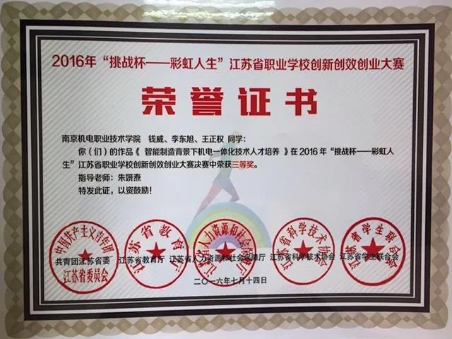 2015-2016学年:“挑战杯-彩虹人生”江苏省职业学校创新创效创业大赛三等奖;
