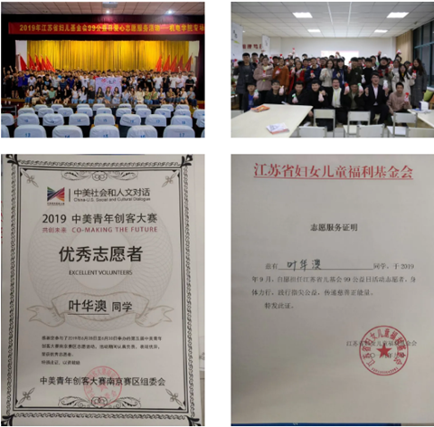 奉献,不是一句空洞的口号,是每一次积极参加青年志愿者服务时留下的汗水。大学期间,他多次参与了志愿者活动。在中美青年创客大赛的南京赛区他为赛事提供专业、优质的志愿者服务。他也是江苏省妇女儿童福利基金会的一名志愿者,在其举办的99公益日活动中身体力行,践行指尖公益,传递慈善正能量。