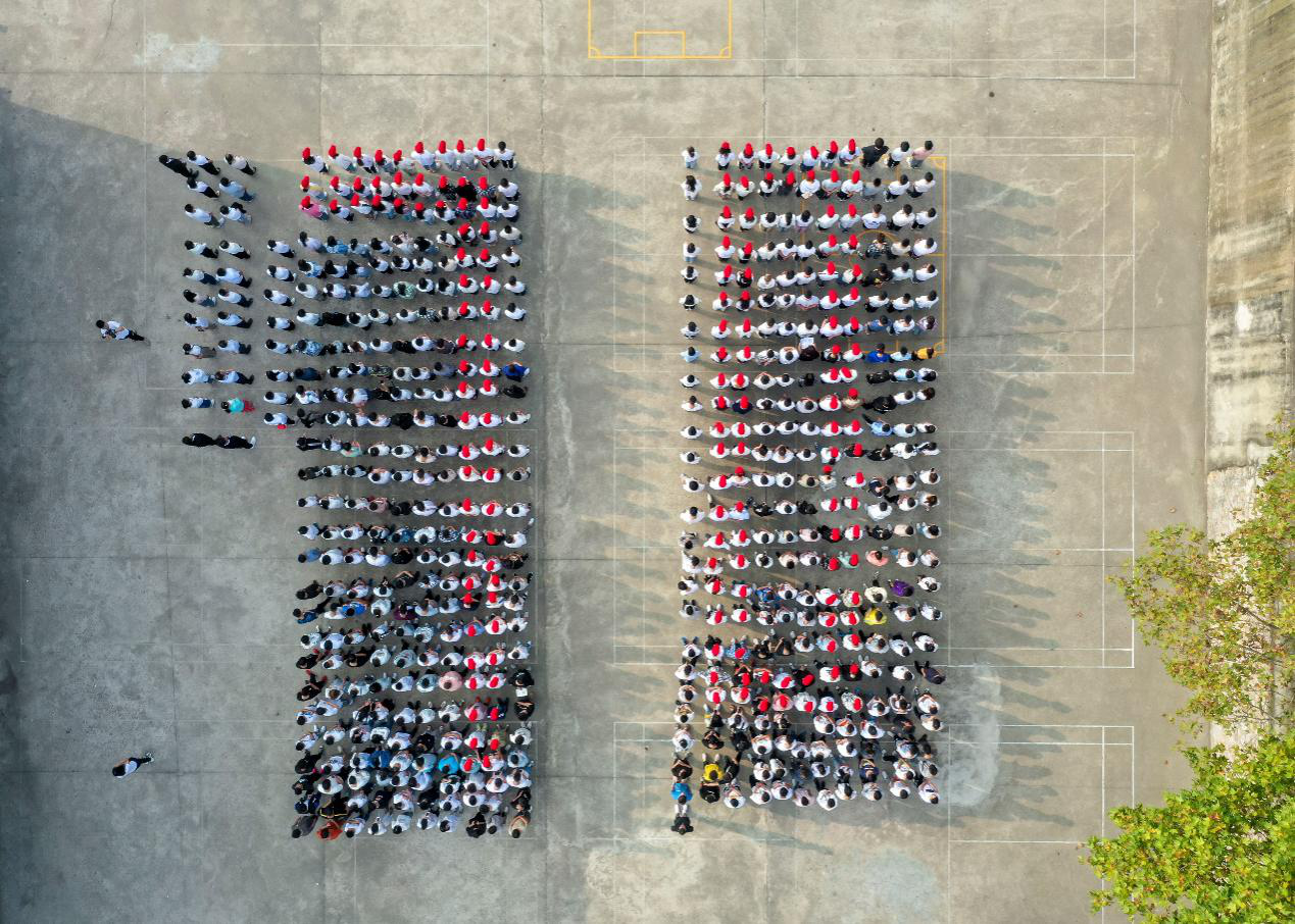 清晨七点,迎着初升的朝阳,开元650余名师生满怀崇敬之情聚集在操场,153名同学在队伍中用小红帽摆出“70”字样。