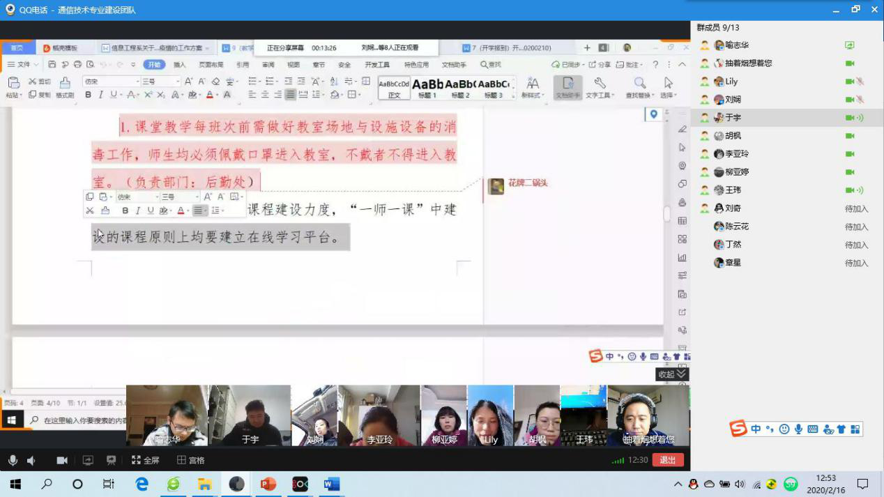 会议开始后,首先由喻志华老师对学院下发的《开元新冠肺炎疫情防控2019-2020学年第二学期教学工作实施方案》《开学前后校门进出工作方案》《开学工作详细实施方案》以及信息工程系下发的《2020年春季学期工作的实施方案》进行了解读。明确了教师的责任和义务。主要提到了,教师上班时需要进行体温测量,体温不正常不准进入校园;进入教室和实训场所授课时必须戴口罩等问题。随后王玮主任对方案进行了补充说明,她表示,通信团队是由专任教师和辅导员共同组成的,团队的每位教师都应提高政治站位,严格按照学院的方案实施,王主任特别提出,并说明了教师需要进行14天的体温测量的工作。最后胡枫书记对学工工作做了进一步的补充,胡枫书记明确提出要确保收集的学生数据真实、准确。