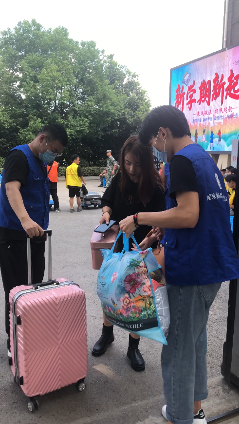 根据安全进入校园流程,学生在进入校园前跟随志愿者进入返校生安全检验通道。首先需要进行体温检测,体温正常才能在志愿者的指引下进行下一环节。第二环节,学生要核验苏康码是否为绿色,最后在志愿者的指导下打开今日校园进行扫码签到,确认无误后进入校园。进入校园后,同学们也不用担心行李过多带来的不便,会有穿着志愿者马甲的志愿者迎接,帮助返校学生们搬运行李。我系志愿者们将行李从校门口搬运至宿舍门口,一次次地往返于校门口和宿舍。在烈日炎炎下,汗流浃背,晶莹的汗水如同雨水般滴落,将衣服湿透,但那飒爽的身姿给学校增加了一抹亮丽的风景线。系部的老师们也进入宿舍,了解大家返校情况,并给每间宿舍送上免洗洗手液,为学生返校生活表示一份系部的心意。