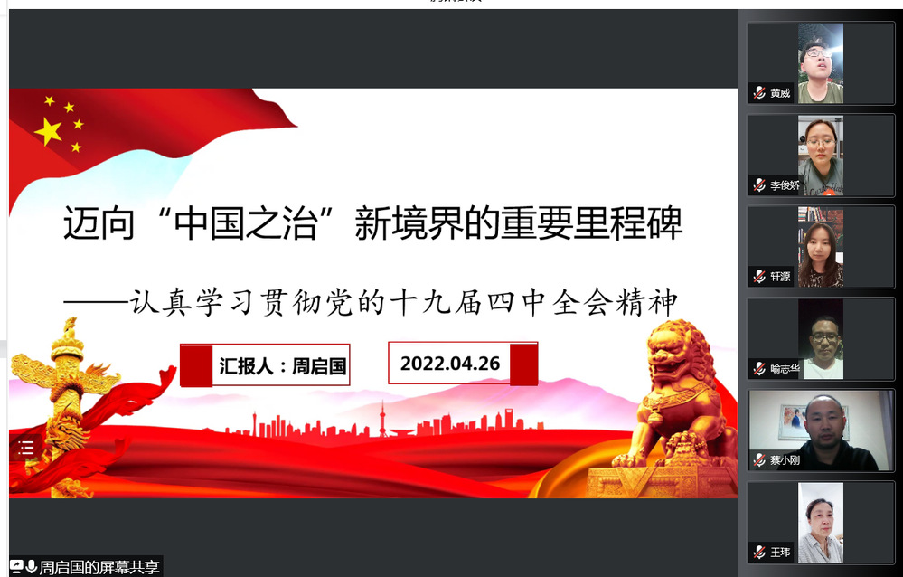2022年4月26日晚,信息工程系通过腾讯会议召开了“迈向‘中国之治’新境界的重要里程碑——认真学习贯彻党的十九届四中全会精神”的专题学习会议。专题会议由学院党委工作部周启国部长主讲,支部书记吴伟萍、系部主任王玮以及全体系部教职工参加了此次学习活动。