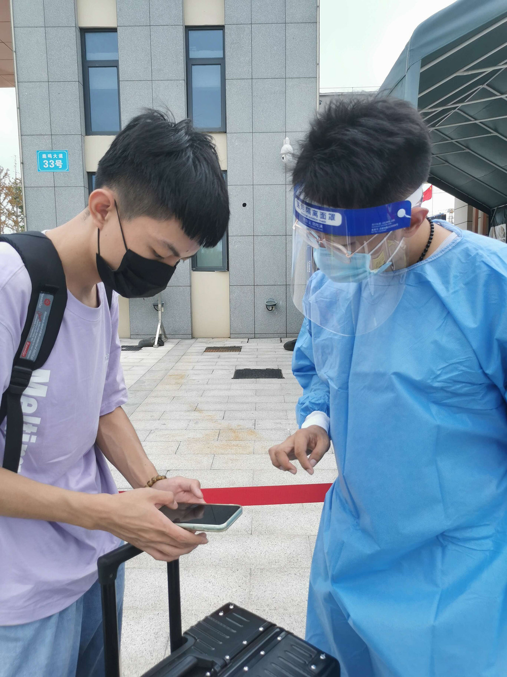 返校学生按照预先制定的错峰安排,陆续抵达学校门口。报道现场,学生们佩戴口罩,在志愿者指引下,完成查验48小时内核酸检测阴性证明、健康码核验、体温检测等程序有序进入校园。整个流程有条不紊、井然有序。