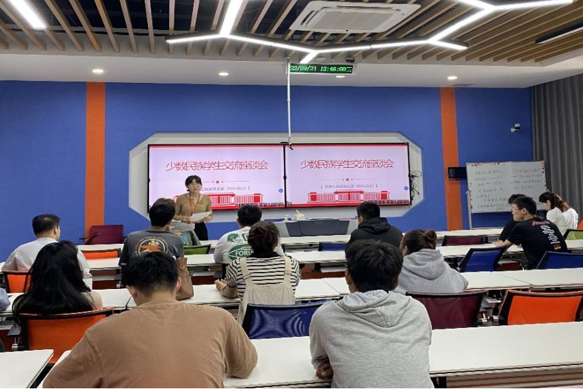 为贯彻落实中央民族工作会议精神,铸牢中华民族共同体意识,深入开展“五亮强基 七彩飞扬”支部特色党建活动之红色旗帜行动,进一步了解系部少数民族学生学习和生活情况,信息工程系党支部于2022年9月21日中午在博学楼411智慧教室召开“团聚民族心,共筑青春梦”少数民族学生座谈会,座谈会采用线上与线下相结合的模式。信息工程系党支部书记胡枫,党支部组织委员、系团总支书记俞宝莹,党支部青年委员、学工干事郝麒和系部三届共计37名少数民族学生均参加本次会议。