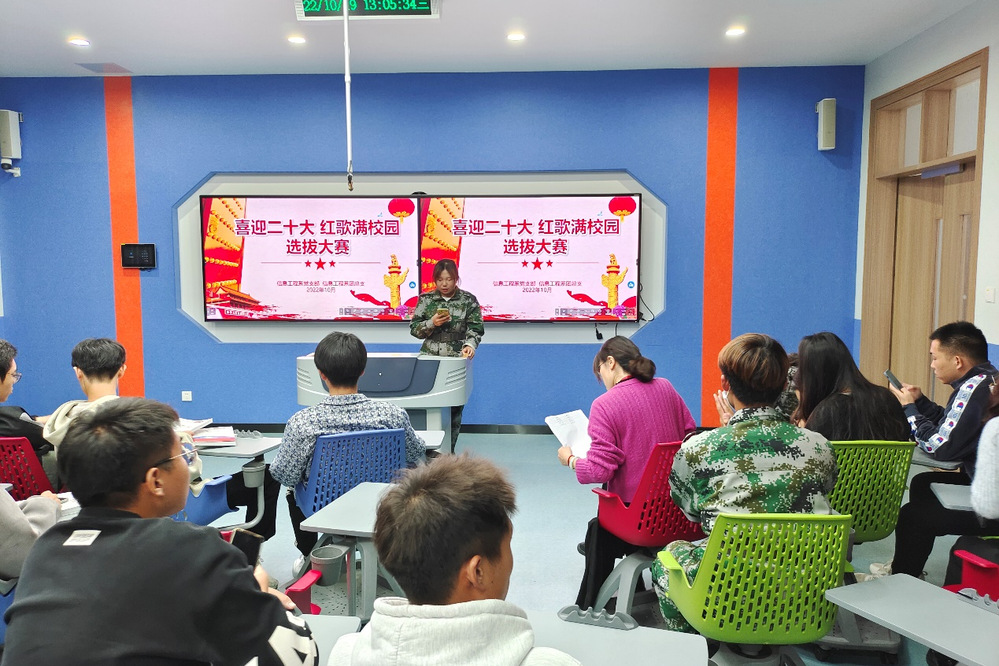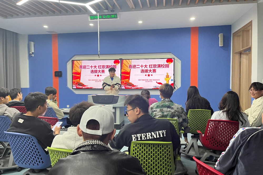 一首经典歌曲,记录一段峥嵘岁月;一首经典歌曲,象征一面光辉旗帜。为弘扬爱国精神,重温红色经典,喜迎党的二十大胜利召开,丰富校园文化生活,我院信息工程系于2022年10月19日中午,在博学楼411举办了“喜迎党的二十大 经典满校园”选拔赛,本次活动由信息工程系党支部、信息工程系团总支组织。