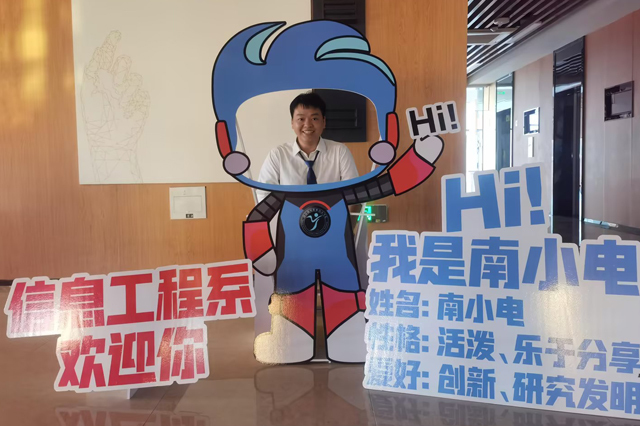 紧接着,我们来到了第二关:弘德楼报到处。在这里放置有“南小电”的拍照立牌,新生们将稚嫩的脸庞放上去完成合影,就可以盖上一枚纪念章啦!合照结束之后找到各自的辅导员提交入学材料,完成报到。到这里,第二关也顺利完成!