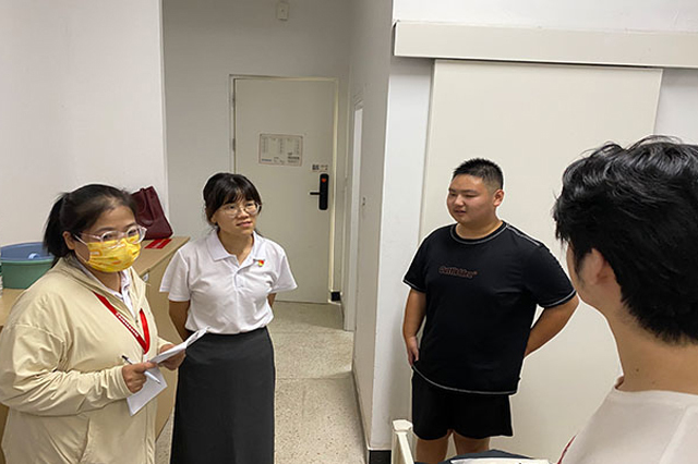 走访期间,姚主任和胡书记向新生介绍了学校入学一周的安排、校园后勤服务保障、学校困难资助政策等内容,引导新生快速适应大学生活,珍惜舍友、同学情谊。随后老师们对宿舍的生活用品、水电设备、周边环境、安全隐患等情况做了细致的检查,还对宿舍用电安全、物品摆放、违规电器的使用进行了详细的讲解。