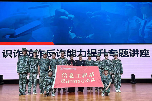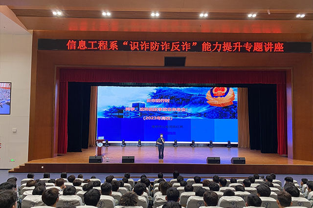为了加强学生网络安全教育,提升学生反诈安全意识,9月20日下午,由校保卫处牵头,信息工程系党支部特邀请南京市公安局内保支队首席反诈专家陈红燕警官到校开展反诈宣讲,为全系23级学生进行了“识诈防诈反诈”能力提升专题讲座。