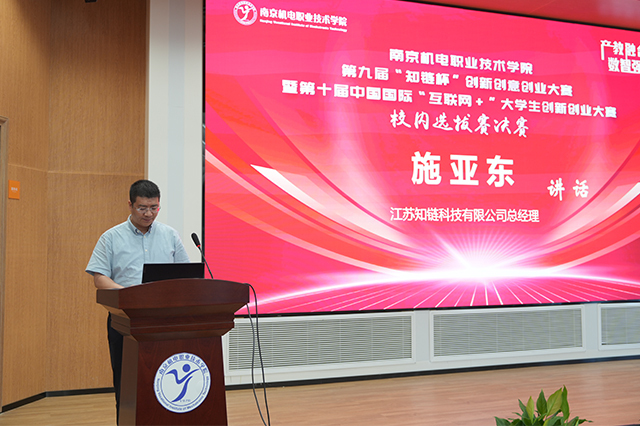 随后,江苏知链科技有限公司总经理施亚东上台讲话。施总经理分享了自己对创新创业的见解,并对开元在三创教育方面取得的成果表示赞赏。他的讲话不仅为在场的师生带来了深刻的启示,也为未来的创新创业之路指明了方向。