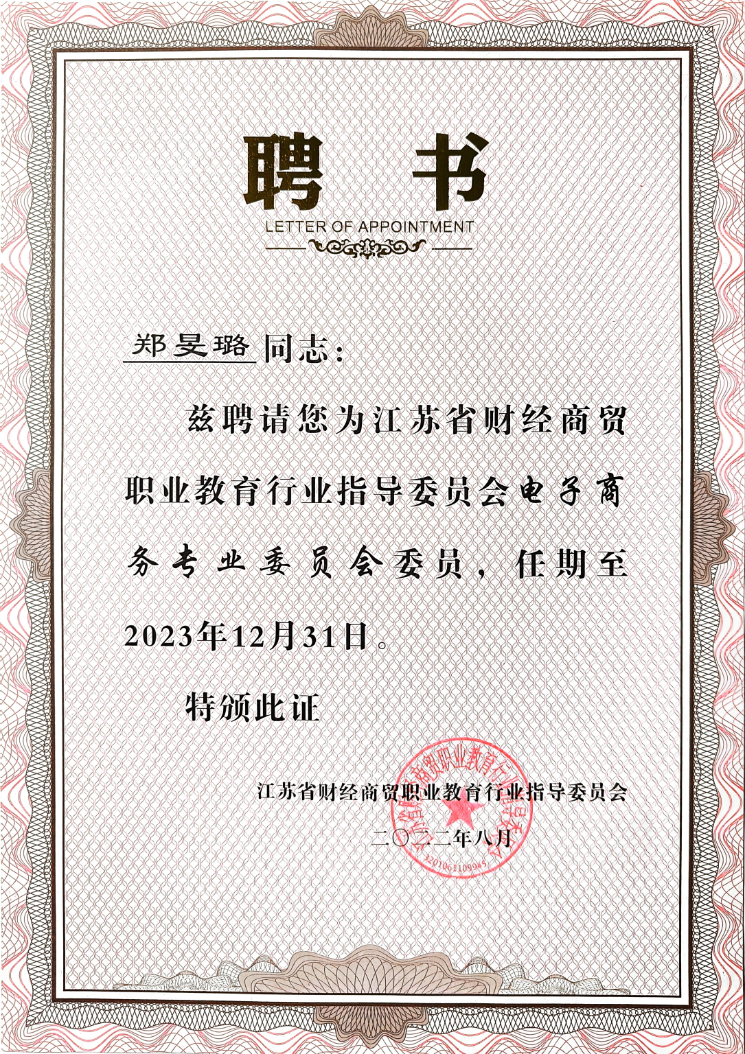 会议中,江苏省人社厅职业能力建设处二级调研员陈彦德强调了职业教育的重要性,指出电商专委员应建立健全政府主导、行业指导、企业参与的职业教育办学机制,强化行业在现代职业教育体系建设和职业教育改革发展中的指导作用。接着,江苏省财经商贸职教行指委副秘书长刘登辉介绍了行指委及6个专委会建设基本情况,希望电商专委会不断探索新形势下行指委工作的新思路、新路径、新模式、新方法,为我省财经商贸类职业教育的高质量发展做出新的贡献。此后,会议审议公布《电子商务专业委员会增补常务委员、委员人员名单》并颁发证书,并由多位专家分享主题报告。最后,专委会各工作组还就下半年工作计划进行了交流和讨论。我校施炜老师被聘任为江苏省财经商贸职业教育行业指导委员会电子商务专业委员会常务委员,郑旻璐老师、陈洁老师被聘任为江苏省财经商贸职业教育行业指导委员会电子商务专业委员会委员。