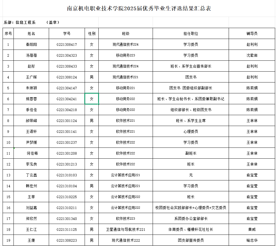 根据《关于评选2025届优秀毕业生的通知》(南机电院学﹝2025﹞4号)文件精神,经班级评选,系部审核,决定拟推荐以下17名同学为2025届开元优秀毕业生。现予以公示,公示时间:2025年4月24日——2025年4月26日。联系人:郝麒,电话:18061237654。