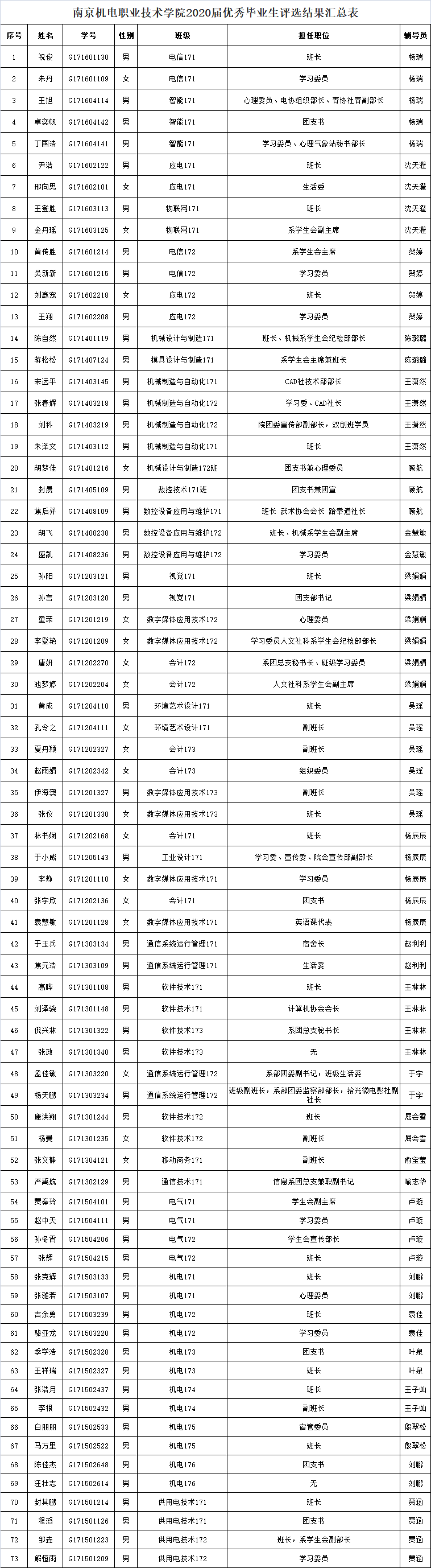 根据南机电院 学[2]号《关于评选2020届优秀毕业生的通知》,经班级评选,系部审核,学工处复核,决定拟推荐以下73名同学为2020届开元优秀毕业生。现予以公示,公示时间:2020年6月24日—2020年6月30日。联系人:宁燕,电话:025-84190262,18061230078。