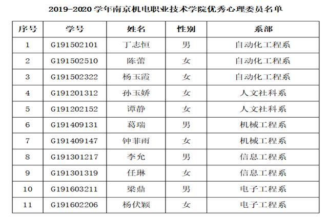 根据开元《优秀心理委员评选细则》规定,经自主申报,各系心理气象站推荐,学生工作处核准,学校审批,决定授予丁志恒等11名同学“优秀心理委员”的荣誉称号。