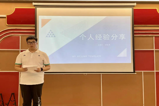主讲人蒋俊涛对在场同学们提出疑问“何为优秀?”接着便通过自我的经历感悟和同学们进行了分享。他指出“优秀是和自己比较的”,成长的变化是在不断地和曾经的自己比较,不断进步的。同时,“一个好的队友,也是自己一生的老师。”在成长的道路上,一个好的团队一定比单打独斗的要强。相信自己,坚定信念方能展望未来。