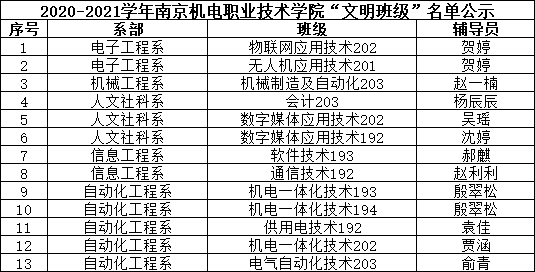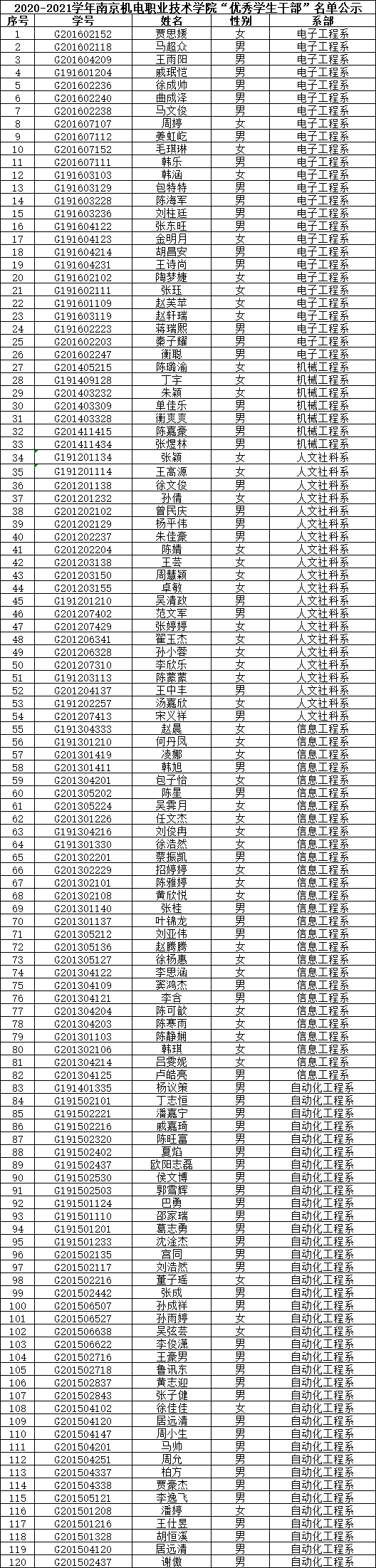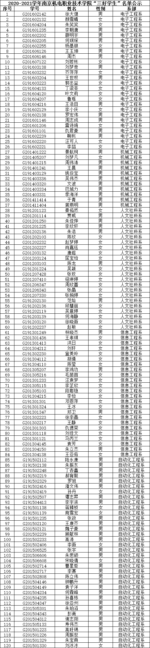 根据《关于评选2020-2021学年“三好学生”、“优秀学生干部”和“文明班级”的通知》规定,经学生本人申请、班级评议,系部审核推荐,学生工作处核准,学校审批,在公平、公正、公开的基础上,拟评选出以下个人和班级为2020-2021学年开元“三好学生”、“优秀学生干部”、“文明班级”,现将名单公示如下。