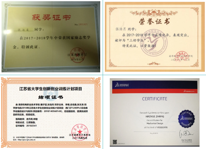大学期间,专业成绩排名系部第二名,综合素质测评排名第一。在班级担任班长、院资助宣传大使,曾任开元单片机社团社长、蓝岛创客工坊学生负责人等。曾获得国家奖学金、国家励志奖学金、全国大学生挑战杯江苏赛区三等奖、中英STEAM江苏赛区最佳编程奖、江苏省大学生创新创业训练计划结项证书、学院奖学金、学院三好学生、学院优秀学生干部、学院优秀共青团员、社团之星、“一二九大合唱”二等奖、优秀标兵等荣誉称号。同时本人获得院优秀社会实践团队、优秀社会实践个人的荣誉称号、“欧帝杯”三创大赛优秀奖等。我所在班级在2018-2019学年被评为“江苏省省级优秀班集体”,“南京市五四红旗团支部”。