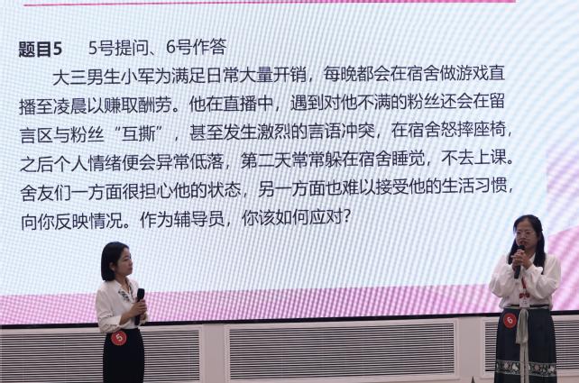 案例研讨环节以“我提问,你回答”的方式开展,每组选手依次进行提问与回答,围绕案例共同辨析原因、研讨对策、总结规律。比赛综合考查了辅导员的语言表达能力、思想教育和心理辅导能力、日常事务处理能力等多方面知识和技能,全方位展现了辅导员的个人素养、知识储备和专业技能。选手们主要针对大学生心理健康、资助、就业、学业、意识形态、学生干部队伍管理等问题进行深入探讨,互相提问,精彩作答。选手现场提问有层次,回答有重点,展示出了辅导员分析问题、研判问题、解决问题的能力。