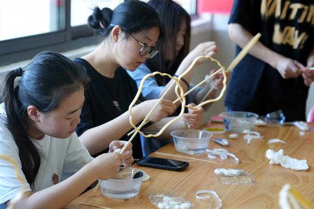 当一把把精致的蚕丝扇终于绕成,同学们无不惊叹于蚕丝的魅力,又迫不及待地挑选自己喜爱的配饰、设计扇面、裱边、装挂流苏,完成最后的点缀。