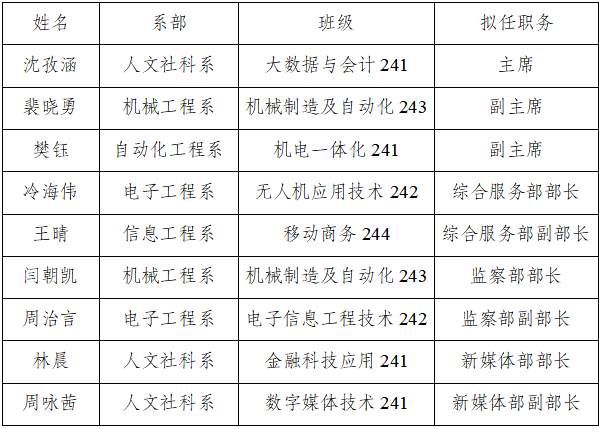 根据《开元“一站式”学生社区学生自我管理委员会章程》相关规定,为切实加强学生干部队伍建设,学生工作处于2025年6月开展了第一届学生自我管理委员会学生干部选拔工作,经学生自主报名、组织推荐、资格审查、竞选答辩、综合考察等环节,选拔产生了拟任人选,为提高学生干部选拔的透明度,现将拟任人选的名单予以公示。